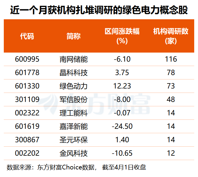 机构关注度方面,东方财富Choice数据显示,近一个月以来,共有17只绿色电力概念股获得机构调研,其中,南网储能获116家机构扎堆调研,晶科科技、绿色动力机构调研数均超70家,军信股份也有48家机构给予关注。