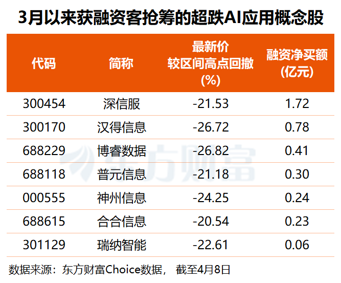 值得注意的是,上述超跌AI应用概念股中,有7股获得杠杆资金逆市加仓。其中,深信服3月以来获融资客抢筹1.72亿元,汉得信息获融资净买入0.78亿元,博睿数据、普元信息、神州信息、合合信息融资净买额均在2200万元以上。