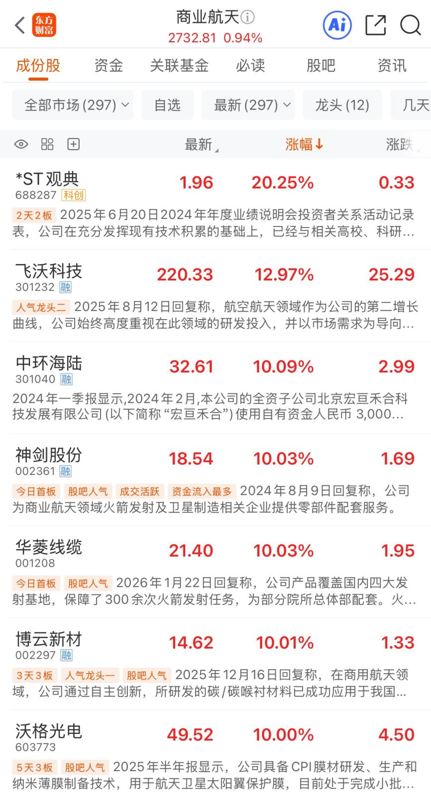 4月15日,商业航天概念高开高走多股涨停。个股方面,飞沃科技涨近13%,中环海陆涨超10%,神剑股份、华菱线缆、博云新材、沃格光电涨停,天润科技、宏明电子涨超9%,西测测试、西部材料涨超8%,江顺科技、广联航空、电科蓝天、巨力索具、坤恒顺维、霍莱沃、航天环宇、顺灏股份等多股涨超5%。