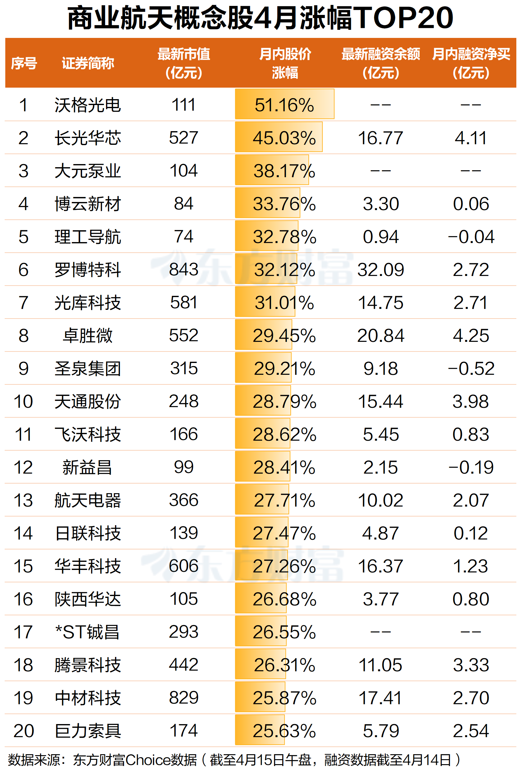 A股方面,在近期商业航天密集消息面刺激下,商业航天概念股整体表现亮眼。4月以来,近300只商业航天概念股中,上涨个股超260只,占比近九成。其中,沃格光电涨幅最大,月内涨超51%;长光华芯紧随其后,月内涨超45%;大元泵业、博云新材、理工导航、罗博特科、光库科技等涨幅位居前列,均超30%。