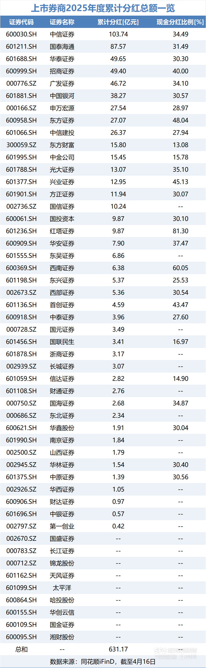 数据显示,截至4月16日,2025年全年券商板块累计分红总额达631.17亿元,已经超过2024全年之和553.98亿元,创下近年分红规模新高。
