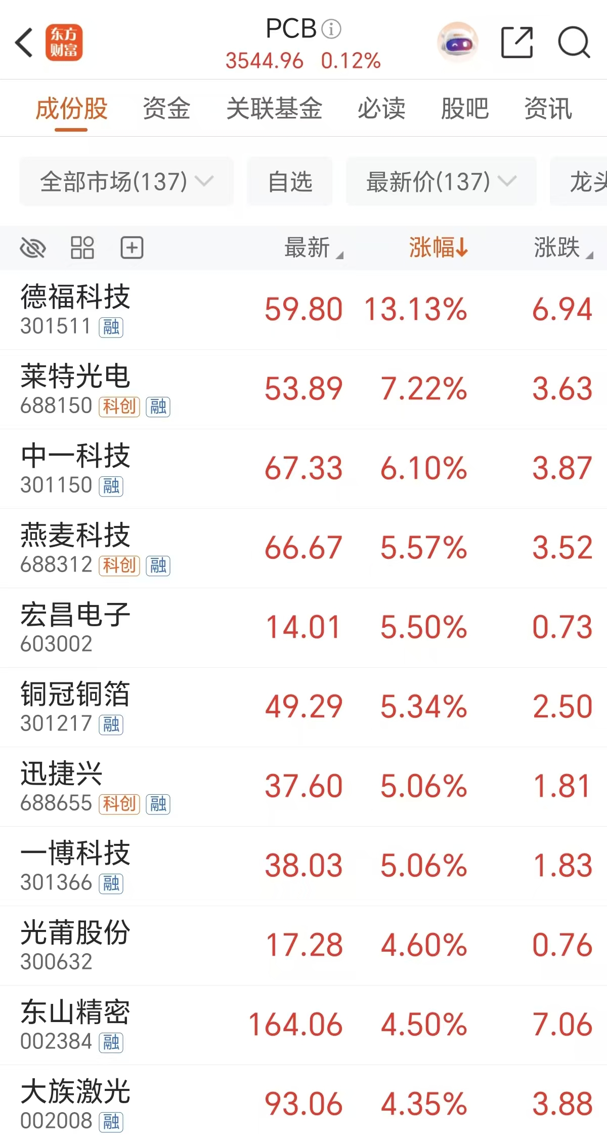 周二PCB概念股逆势活跃,截至午间收盘,德福科技涨超13%,莱特光电、宏昌电子、铜冠铜箔等跟涨。