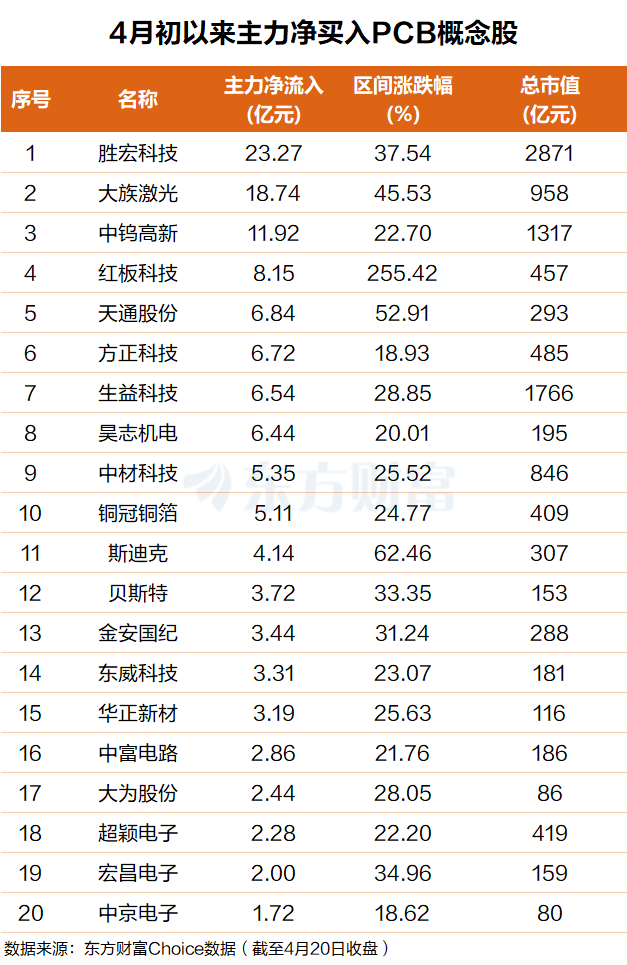东方财富Choice数据显示,自今年4月初以来,主力资金抢筹了一批PCB概念股。胜宏科技排名第一,主力净买入超23亿元;大族激光排名第二,主力净买入超18亿元。