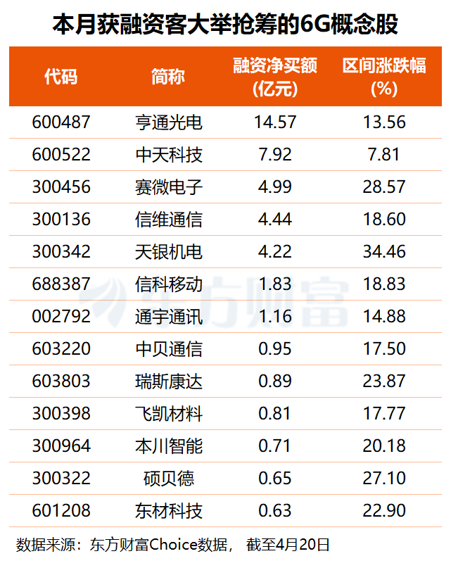 资金方面,东方财富Choice数据显示,本月共有20只6G概念股获得融资净买入,亨通光电获杠杆资金大幅加仓14.57亿元,中天科技获融资客抢筹7.92亿元,赛微电子、信维通信、天银机电融资净买额均超4亿元。