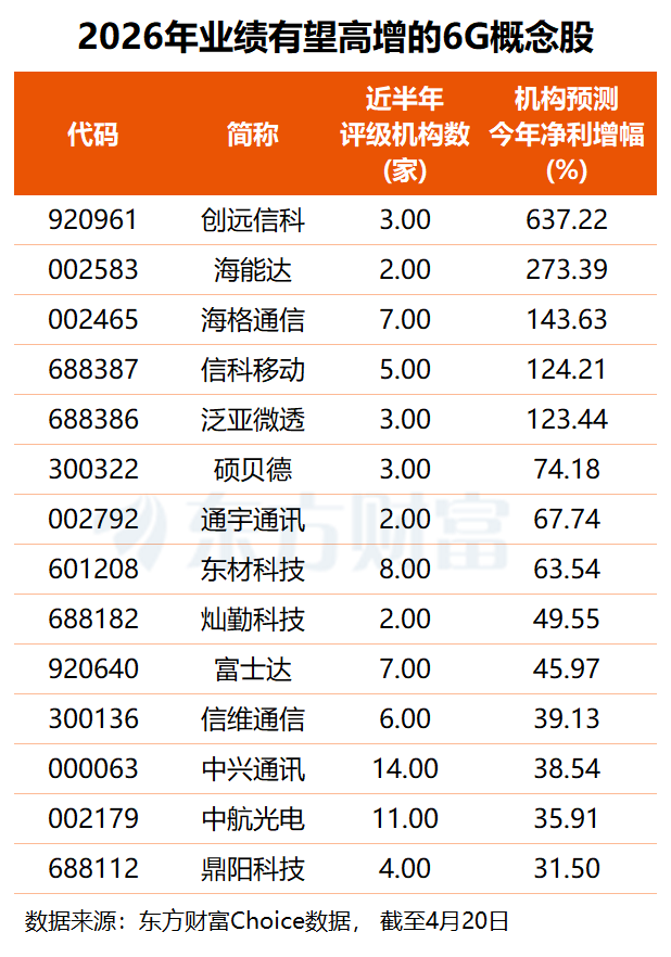 从业绩角度看,根据2家及以上机构预测,共5只6G概念股2026年业绩有望翻倍增长,其中,机构预计创远信科今年净利或同比大增6.4倍,海能达也将实现超2.7倍净利增长,海格通信、信科移动、泛亚微透预测净利增幅均在123%至144%之间,硕贝德、通宇通讯、东材科技也有望实现六成以上业绩增长。