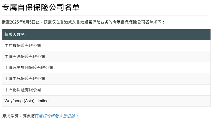 截至8月5日,获授权在香港或从香港经营保险业务的专属自保保险公司共有6家,分别是中广核保险有限公司、中海石油保险有限公司、上汽自保、上海电气保险有限公司、中石化保险有限公司、Wayfoong (Asia) Limited。