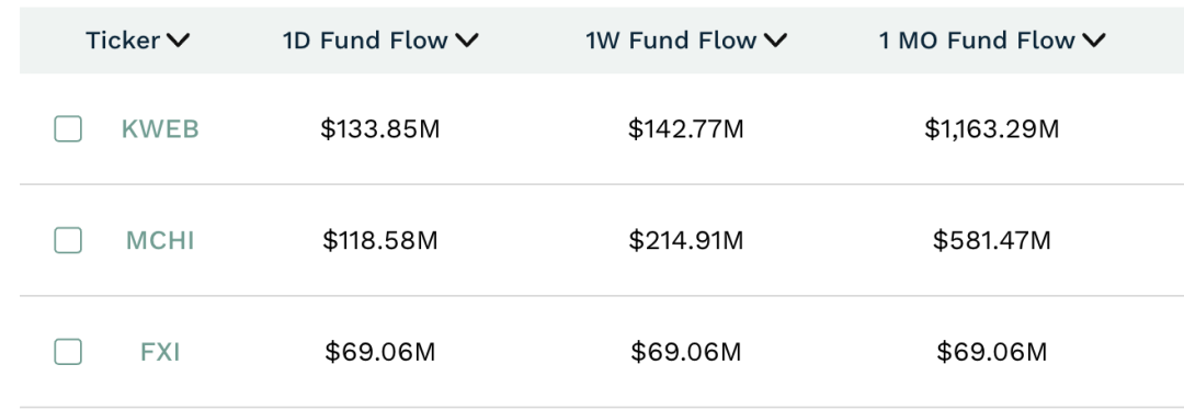 来自ETF的数据显示,截至8月15日,过去一个月,KWEB、MCHI、FXI合计吸引资金净流入18.13亿美元,约合130.26亿元人民币。