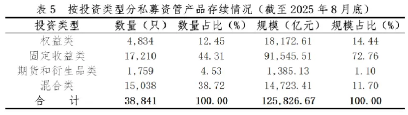 从投资类型看,固定收益类产品存续数量和规模均占据4类产品最大比例。截至月底,固定收益类产品共计17210只,对应占比44.31%;资管总规模9.15万亿元,对应占比72.76%,显示出固定收益类产品在私募资管市场中的主导地位。