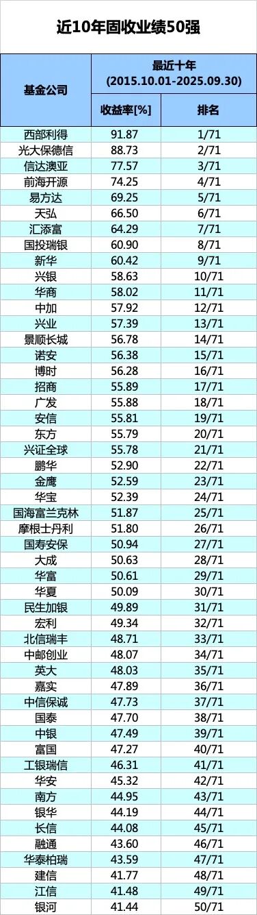 债券市场呈现“牛长熊短”特征,但多轮牛熊转换考验基金公司投研能力。数据显示,2015年10月1日至2025年9月30日,西部利得基金以91.87%的收益率居首,光大保德信基金以88.73%紧随其后,仅两家公司10年收益率超80%。信达澳亚、前海开源基金分列第三、四位,收益率达77.57%、74.25%。易方达、天弘等大型基金公司收益率超60%,17家大型公司平均收益率为53.99%,显著高于中小型公司。固收类产品更依赖团队综合实力,大型基金公司优势明显。