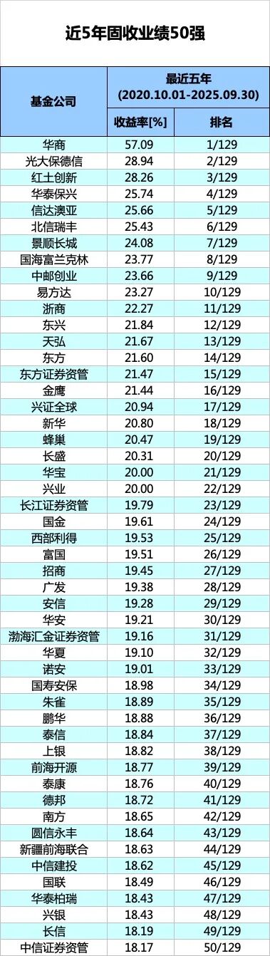2020年10月1日至2025年9月30日,华商基金以57.09%的净值增长率居129家可比公司之首,光大保德信基金以28.94%位居第二,红土创新基金以28.26%排名第三。华泰保兴、信达澳亚等公司收益率超25%。大、中、小型基金公司5年平均收益率分别为19.17%、17.75%、16.61%,大型公司仍具领先优势。