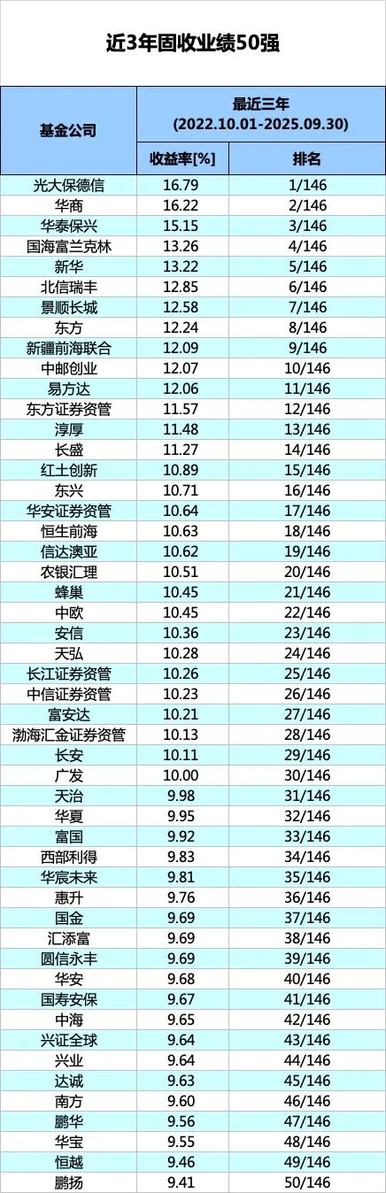 2022年10月1日至2025年9月30日,债券市场宽幅震荡,光大保德信基金以16.79%的收益率拔得头筹,华商基金以16.22%紧随其后。华泰保兴、国海富兰克林等公司收益率超13%。18家大型基金公司平均收益率为9.75%,14家中型公司为8.86%,114家小型公司为8.49%。