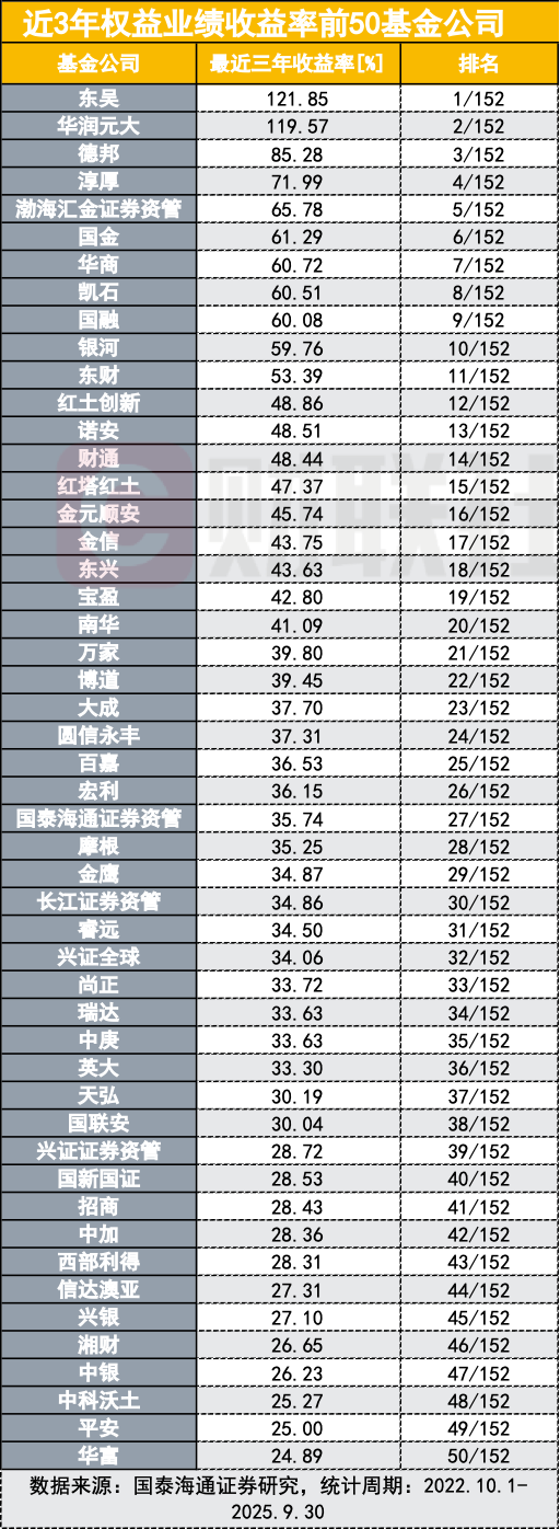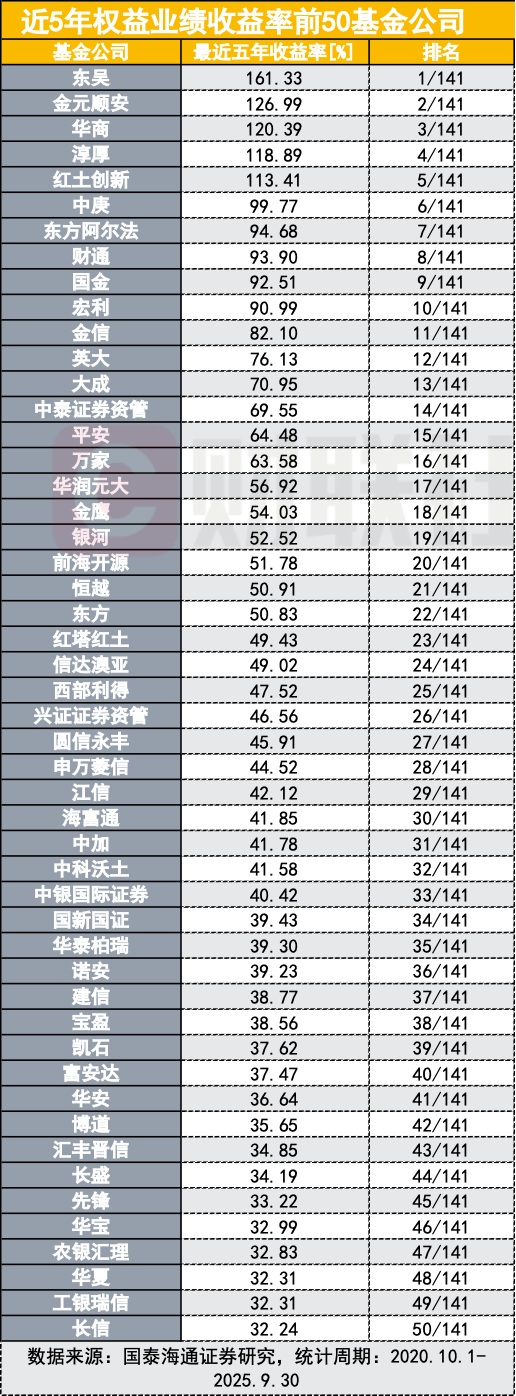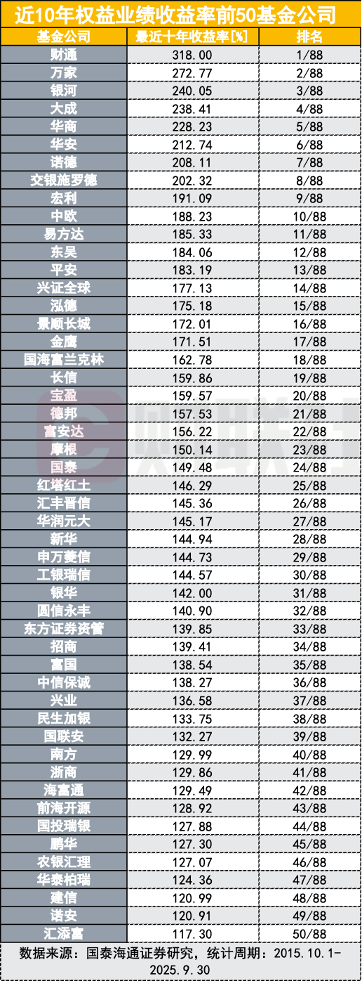单季度业绩之余,更值得关注的是,3900点的轮回里,谁在这10年业绩领跑行业?三季度165家基金公司权益基金全部正收益,赚钱效应依然贯穿了今年三季度,国泰海通证券研究表示,2025年7月,在外部扰动下,国民经济顶压前行、稳定运行,主要指标好于预期,二季度继续保持较强韧性,叠加近期中央持续强化“反内卷”政策导向,A股延续反弹势头;8月指数稳步上涨,9月高位震荡,科技依然吸金。在此背景下,三季度上证综指上涨12.73%,深证成指上涨29.25%。主要指数方面,上证50指数上涨10.21%,沪深300指数上涨17.90%,中证500指数上涨25.31%,创业板指上涨50.40%,科创50上涨49.02%。