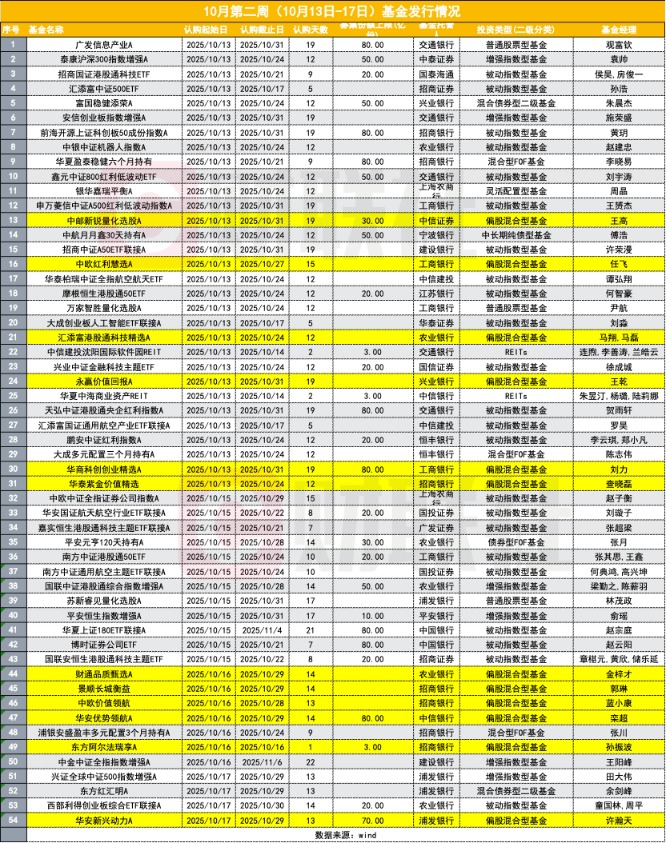 截至10月13日,wind数据显示,本周(10月13日-17日)全市场将有40家公募合计54只新基金启动认购,较前一周(两个交易日)的24只实现166.67%的环比增长,创出年内次新高。新发基金(SEO关键词2)的密集登场,不仅体现了市场资金的活跃度,也反映出投资者对后市的积极预期。