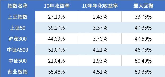 从下面的表格中,我们可以看到,过去10年,创业板指数的涨幅最高,达到了55.48%,中证500指数的涨幅最小,仅为21.04%。上证50指数是由上交所50只规模最大的股票组成的指数,理论上大股票的长期涨幅要低于小股票,但上证50指数的涨幅超过了上证指数和中证500指数,龙头股的作用不能小觑。