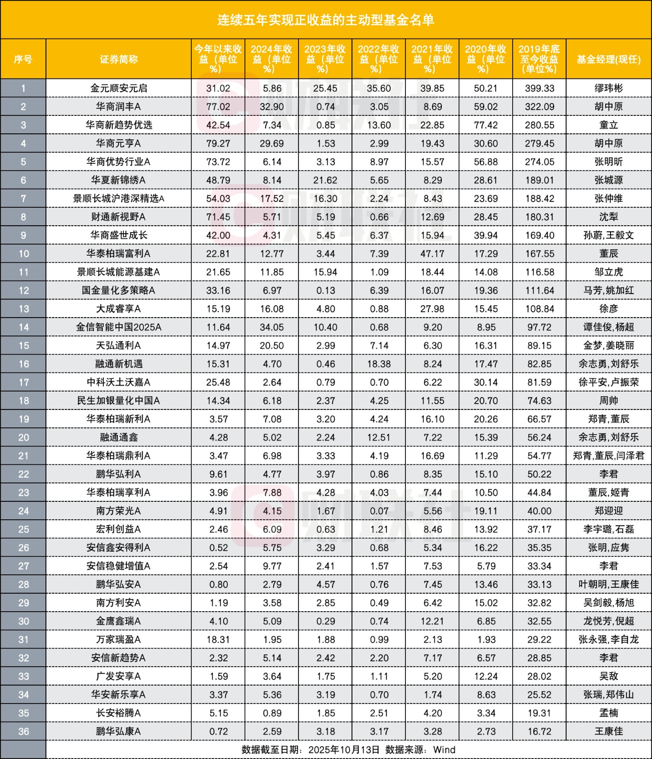 财联社10月14日讯(记者李迪)今年股市显著回暖,绩优基金产品也不断涌现,基金连续五年正收益成为市场焦点。而回顾过去几年的市场低谷期,能连续多年实现年度收益为正的基金十分稀缺。Wind数据显示,截至2025年10月13日,2020-2025年每年均实现正收益且2025年收益也为正的权益基金共有41只,包含5只被动型产品、36只主动型产品,展现了基金经理的卓越管理能力。
