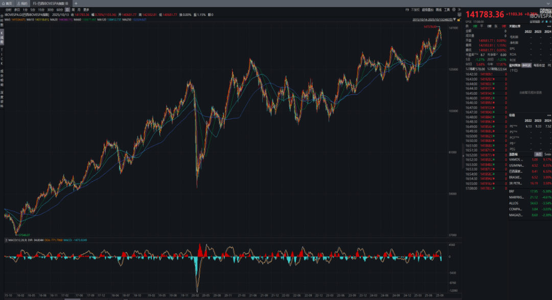 中国证监会网站显示,10月13日,华夏基金申报了“华夏布拉德斯科巴西伊博维斯帕股票交易型开放式指数证券投资基金(QDII)”,易方达基金申报了“易方达伊塔乌巴西IBOVESPA交易型开放式指数证券投资基金(QDII)”。公开资料显示,伊博维斯帕指数的成分股中包含淡水河谷(Vale)、巴西石油公司(Petrobras)等与大宗商品、资源型经济紧密相关的企业,其走势可能与国际商品价格、中国需求等因素关联紧密。作为重要的新兴市场资产指数,截至10月14日,伊博维斯帕指数今年以来收益率为17.87%。