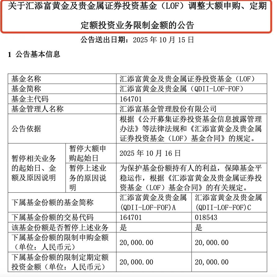 就在上月,汇添富基金刚刚公告,自2025年9月2日起汇添富黄金及贵金属(QDII-LOF-FOF)A、C份额限制大额申购、大额定期定额投资业务,限制金额为50000元。