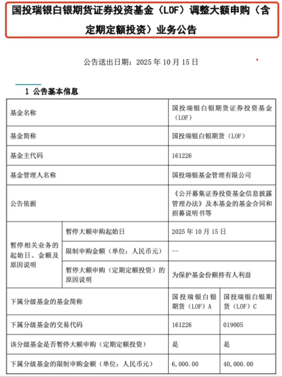 同日,国投瑞银基金也发布公告称,为保护基金份额持有人利益,自2025年10月15日起,限制国投白银A类、C类基金份额的定期定额投资金额分别为6000元及40000元。