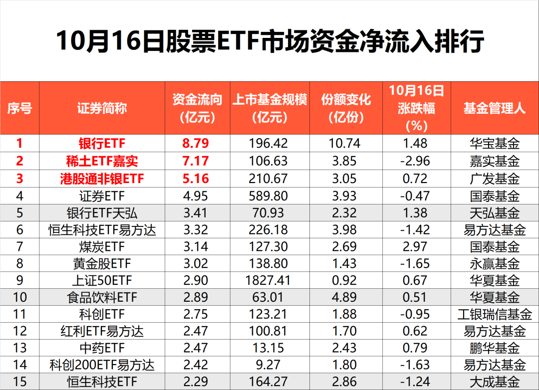 华安基金表示,中美博弈扰动科技板块情绪,全球避险情绪升温导致资金分流,国际金价不断创出历史新高,反映出全球资金风险偏好下降,从新兴市场科技股向黄金等资产回流。近日科技股“熄火”背景下,银行、券商、煤炭等板块活跃,银行ETF、稀土ETF嘉实、证券ETF等产品净流入居前。港股市场ETF依然“吸金”,港股通非银ETF、恒生科技ETF易方达等产品,也备受资金青睐。市场震荡背景下,头部基金公司旗下ETF持续获得资金净流入。