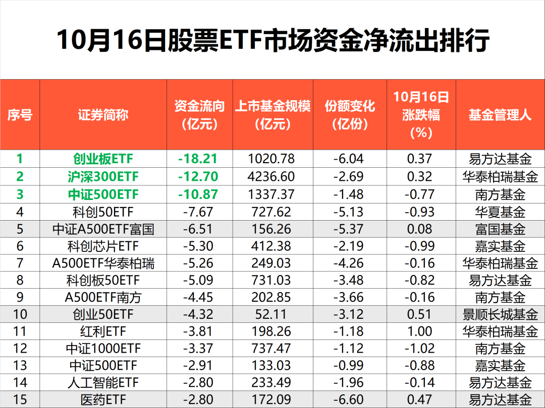 10月16日,A股三大指数涨跌互现,市场风格出现变化:资金流向红利板块,煤炭板块集体大涨,保险、银行板块涨幅居前,白酒板块集体走强;而光刻机概念股调整,可控核聚变概念股走低。市场风格轮动、投资方向切换背景下,昨日股票ETF市场净流出超50亿元,中证A500指数等宽基指数净流出居前;近期大涨的“黄金赛道”疯狂“吸金”,近5日资金流入SGE黄金9999指数超150亿元,净流入恒生科技指数超100亿元,ETF市场(基金)呈现明显分化。