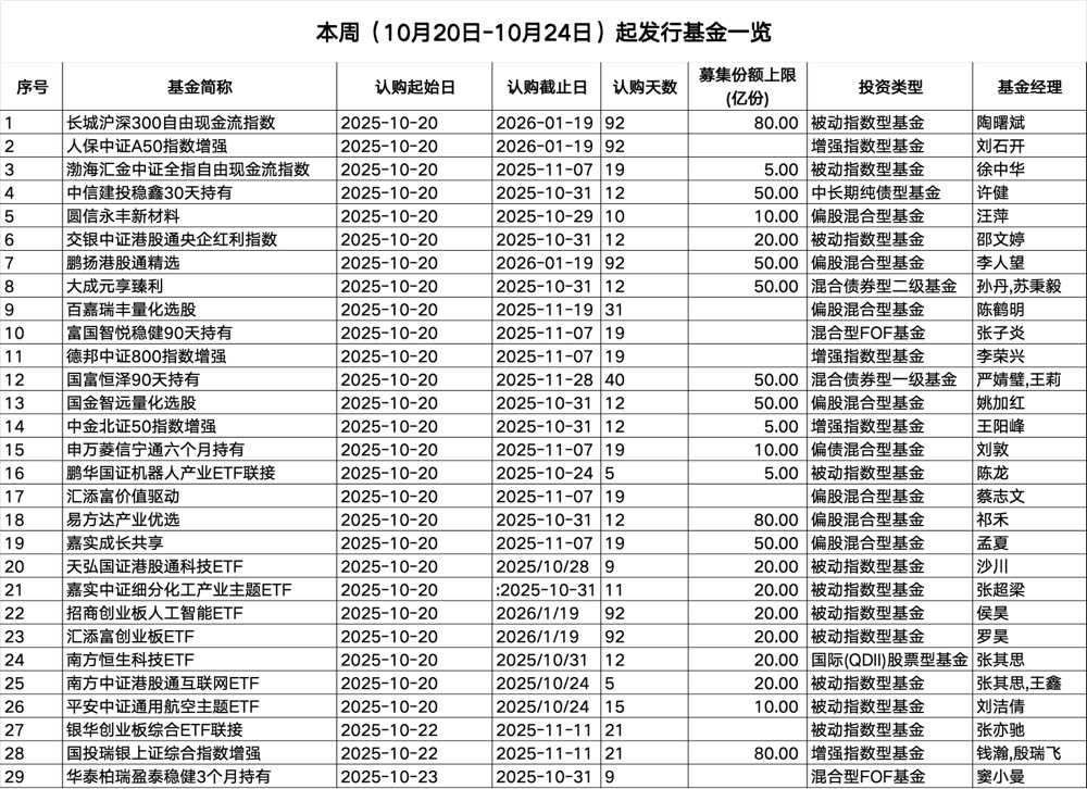 具体来看,周一(10月20日)仍是新基金发行的关键日,本周29只新发基金中,有26只扎堆在周一发行,占本周新发基金的近九成;周二、周五无新基金启动募集,周三、周四分别有2只、1只基金开始认购,发行节奏呈现明显集中特征。