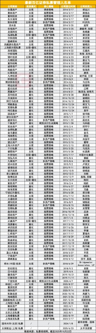百家百亿私募分布情况如何?一是投资模式分布来看,在当前的100家百亿私募中,量化私募数量依然占优,共46家;主观私募紧随其后,共44家;混合策略私募有8家;另有2家机构尚未披露投资模式。二是核心策略方面,股票策略仍占据主导地位。数据显示,76家百亿私募的核心策略为股票策略;多资产策略有13家;债券策略为6家;期货及衍生品策略共2家;另有1家机构以组合基金为核心策略。此外,还有2家百亿私募尚未披露其核心策略。此轮扩容中,新晋百亿私募以主观私募为主,9月以来新晋9家百亿私募中,主观占比为6家。主观私募规模上升迅速,与当前环境复杂多变的市场环境相关。一般而言,主观型私募策略灵活度高,能够依据宏观经济形势与政策变化及时调整仓位和行业配置,从而更好地适应市场波动。同时,部分主观私募的基金经理具备丰富的投资经验和较强的选股能力,在复杂行情中更能甄别优质标的,实现相对优异的业绩表现,吸引资金持续流入,进而推动规模增长。值得注意的是,业绩带动规模上升也是重要原因。以今年三季度来看,科技板块强势的结构性行情为主观投资带来“反超”的机会,2025年三季度主观多头产品平均收益为20.43%,跑赢同期量化多头产品(平均回报率为17.41%)。