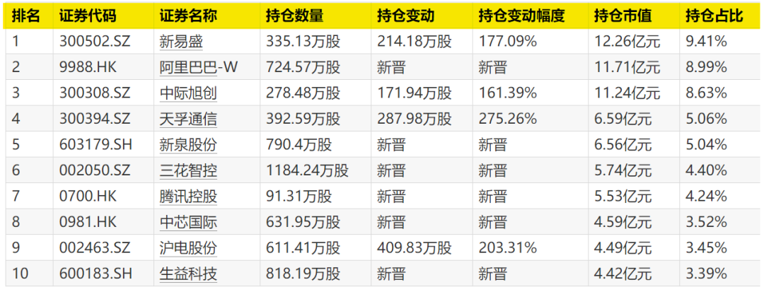 具体来看,根据三季报,前三大重仓股为新易盛、阿里巴巴-W、中际旭创,持仓市值均超11亿元。