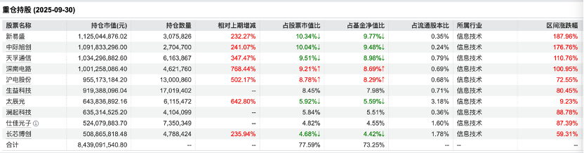 重仓算力依然是该基金的主要持仓方向。任桀在季报中表示,三季度维持高仓位运作,基于二季度做出的“全球模型/应用-算力投入闭环形成,中国光通信、PCB厂商分享全球AI发展红利”的判断,继续聚焦全球云计算产业链的投资,这一逻辑在5-8月得到验证,海外算力板块完成了一轮业绩与估值的双击。冠军基也对重仓股进行了调整,三季度新增了生益科技、澜起科技、仕佳光子三只个股。新调入三只重仓股在今年三季度分别涨幅80.45%、88.78%、87.39%(关键词:重仓算力,云计算产业链)。