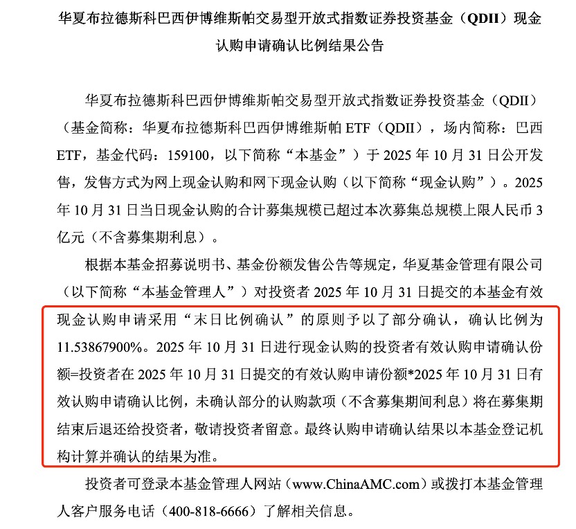 财联社11月5日讯(基金动态)11月4日晚间,易方达基金公告了旗下巴西ETF认购申请确认比例结果,该确认比例为11.823%,稍早华夏基金也公告同类产品确认比例低至11.538679%。这意味着,投资者认购10万元最终仅能确认1.18万元或1.15万元,2只巴西ETF认购比例创2022年以来新基金认购最低纪录,引发市场对跨境ETF投资价值的深度关注。