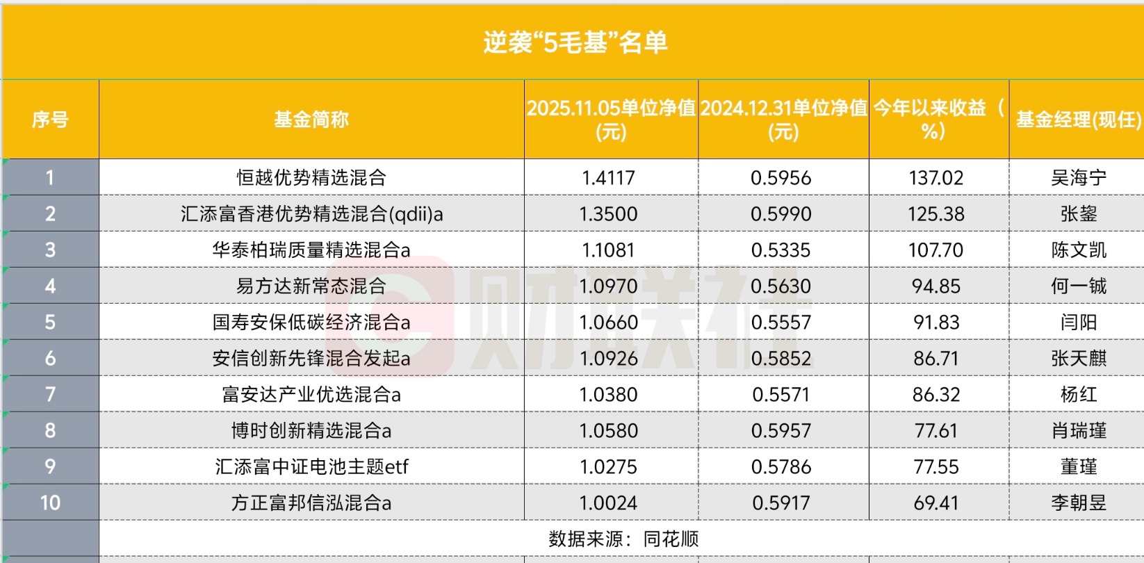 前几年股市震荡时,不少权益基金深陷亏损泥潭,一些产品甚至跌成“5毛基”。但今年以来,随着股市结构性回暖,一批“5毛基”抓住机遇实现逆袭,基金逆袭成为市场热点。数据显示,有10只去年年末净值低于0.6的基金,在今年11月5日将净值拉回1以上。这10只基金里,9只为主动权益产品,仅汇添富中证电池ETF一只指数基金。其中,恒越优势精选混合更是实现了137.02%的年内收益。