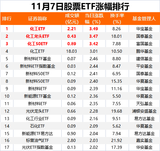 Wind数据显示,截至11月7日,全市场共1246只股票ETF总规模达4.64万亿元。当日股票ETF成交额合计1663.13亿元,与前一交易日1975.42亿元相比明显缩量,减少近16%。其中,香港证券ETF当日成交额为69.53亿元,位居首位。此外,有1只ETF成交额在50亿元以上,为A500ETF基金;4只ETF成交额突破40亿元,分别为港股创新药ETF、中证A500ETF、A500ETF华泰柏瑞、A500ETF易方达。从股票ETF二级市场表现看,化工ETF领涨3.49%,化工龙头ETF涨3.47%,化工50ETF涨3.42%。新材料板块相关ETF二级市场涨幅也比较大。新材料ETF基金、新材料ETF指数基金、新材料50ETF等基金单日涨幅均超2%。港股互联网板块表现不佳,港股互联网ETF位居当日股票ETF跌幅榜前列。