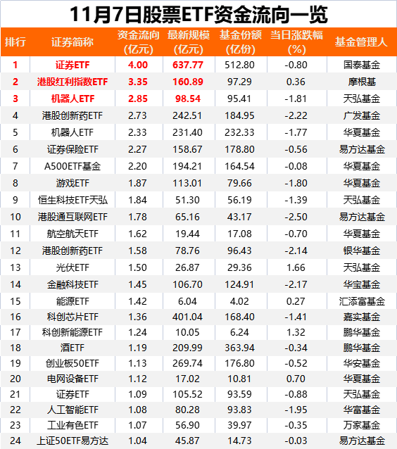 数据显示,头部基金公司旗下部分ETF净流入步伐持续。易方达基金旗下ETF最新规模为8267.3亿元,2025年以来规模增加2260.8亿元(净流入443.1亿元,净值增量为1817.7亿元)。11月7日,证券保险ETF净流入2.3亿元,港股通互联网ETF净流入1.8亿元,上证50ETF易方达净流入1.0亿元,人工智能ETF净流入0.5亿元,储能电池ETF净流入0.4亿元。华夏基金旗下ETF方面,机器人ETF和A500ETF基金单日净流入居前,分别净流入2.33亿元和2.2亿元,最新规模分别达231.4亿元和194.21亿元。华夏基金旗下机器人ETF和A500ETF跟踪的指数近一月日均成交额分别为13.27亿元和50.36亿元。华夏基金基金经理张景松表示,短期市场在寻求结构调整,中期趋势与核心方向未变,大盘成长中仍有多元化的投资机遇。同时,市场可能会在低位、具备主题性的板块中选择切换方向,但实际交易操作难度很大。建议坚定把握具备基本面反馈的成长景气板块,继续围绕产品创新周期、库存周期进行布局。易方达基金指数研究部总经理庞亚平认为,展望后市,基本面对股市造成的压力有限,而内外宽松的流动性环境、A股夏普比率改善与性价比提升,有望提供估值支撑,预计全A流动性牛市有望延续,建议关注中证A500ETF、沪深300ETF等宽基ETF的投资价值。