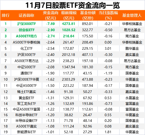 上周五(11月7日),A股三大指数震荡调整,集体收跌,市场高位调整中,股票ETF市场资金流向快速切换,ETF投资成为市场焦点。前一日整体净流出超131亿元后,上周五全市场股票ETF(含跨境ETF)资金转为净流入,其中港股市场ETF净流入金额居前,ETF市场表现引发投资者关注。