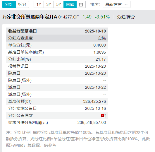 此外,成立于2021年的万家北交所慧选两年定期开放混合,则在今年10月进行成立以来的首次分红。该基金规模在今年三季度末达到历史最高的6.86亿元。首次分红以10月10日为基准日,分红方案为4元/10份基金份额,分红总额达1.31亿元,这也是今年以来(按权益登记日统计)单位分红最多的主动权益基金。