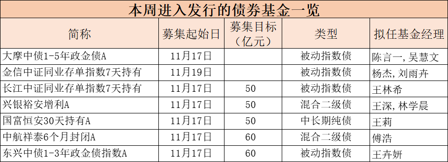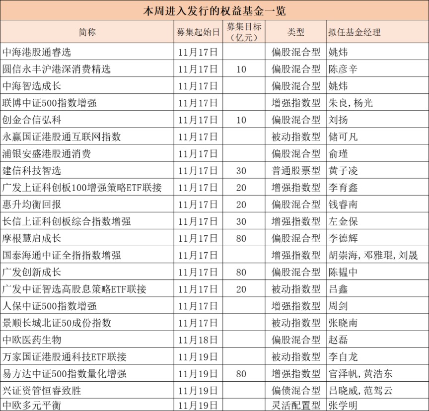 Wind数据显示,根据基金公司发布的截至11月17日的募集公告,本周(11月17日—11月21日)5个交易日中,33只新基金将登场,面向投资者公开发行。其中,26只扎堆在周一发行,具体来看,周一(11月17日)本周33只新发基金中26只扎堆在周一开始发行,占本周新基金的78.79%;周二有1只新基金启动募集,周三有6只基金开始认购。
