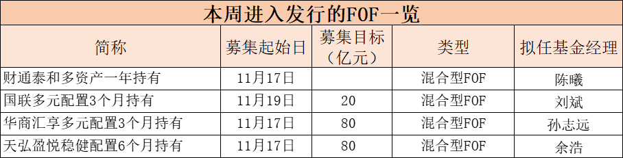 市场震荡中,固收+基金和FOF受青睐。此外,本周新基金中仅有7只债券型基金,其中有2只同业存单基金和2只政金债指数基金。随着权益市场回暖,债券市场连续下跌,债券基金尤其纯债基金发行热度明显下降。不过,进可攻、退可守的“固收+”基金相对而言较受关注,新发基金持续上架,兴银裕安增利和中航祥泰6个月封闭于本周启动发行。此外,本周有4只混合型FOF产品集体上架。今年以来,随着权益市场企稳回升、投资者信心逐步恢复,FOF也明显回暖,Wind数据显示,截至10月31日,全市场成立满6个月的477只FOF年内收益均为正,且平均收益率达14.29%。另从规模来看,截至三季度末,全市场FOF规模合计达到1871.47亿元,相较去年末增长570亿元。这意味着,在复杂多变的市场环境中,不少投资者倾向于通过具有多元配置属性的产品来追求资产增值。与此同时,FOF在新基金发行市场的热度也在攀升,进入越来越多基金公司的布局视野。