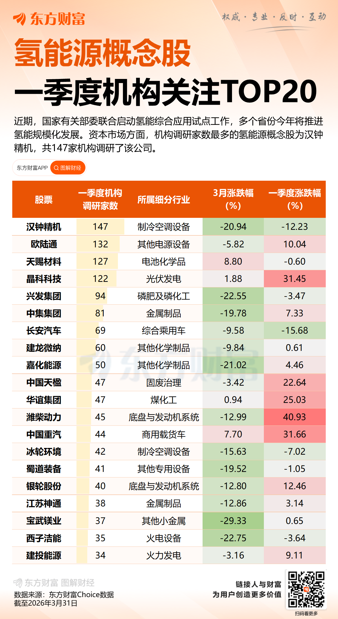 政策加速氢能规模化发展 一季度机构调研TOP20概念股出炉