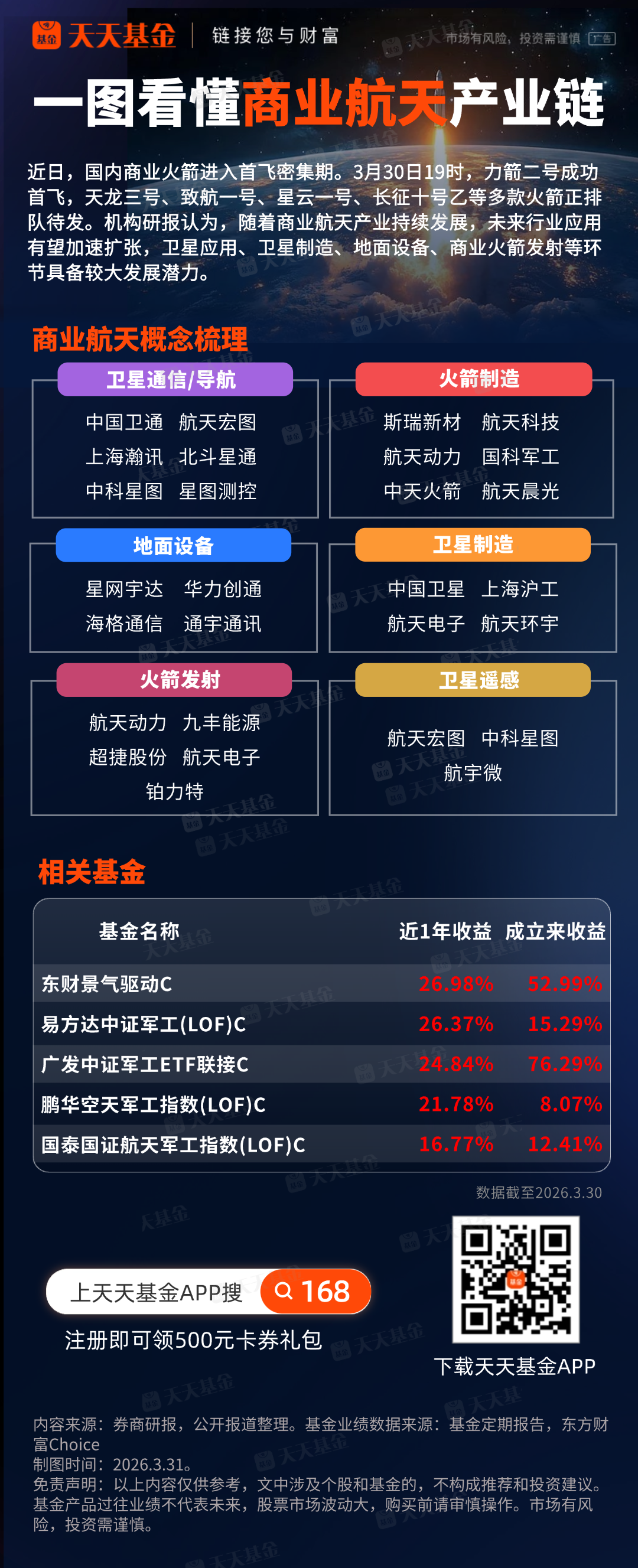 展望后市,国盛证券指出,尽管在中东战争对于市场的冲击之下,商业航天板块亦经历波动,但产业技术突破与商业化进程仍在持续提速。因此,投资布局应紧扣产业核心价值环节,建议聚焦火箭及上游产业链、卫星制造与核心部件、卫星通信应用与服务等四大主线。