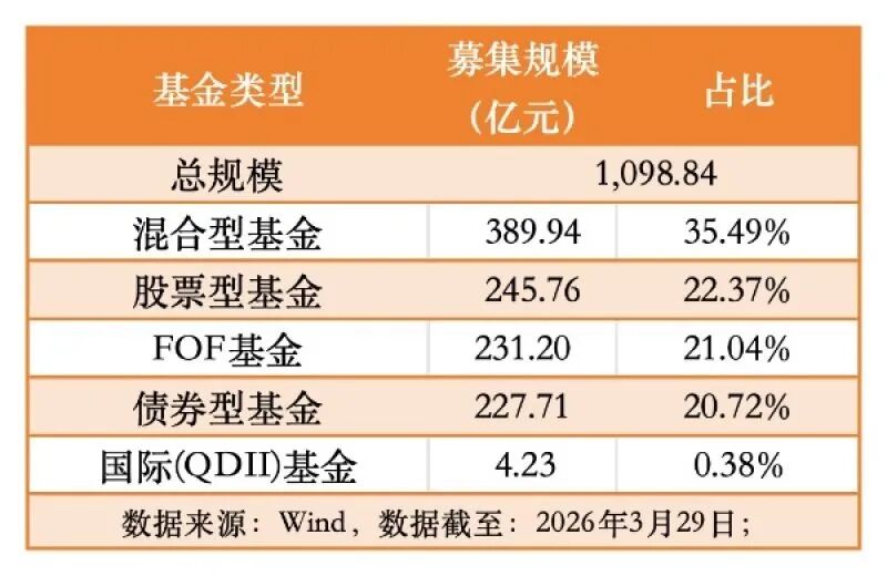 产品结构发生明显转变。股票型与混合型基金合计发行规模占全月新发基金总规模的比重超过57%,较2025年同期的47%显著抬升;债券型基金占比则由43%降至20%。与此同时,FOF产品出现增长,截至2026年3月29日,年内新成立FOF产品达53只,合计募集规模690.49亿元,已达到2025年全年新发规模的82%。