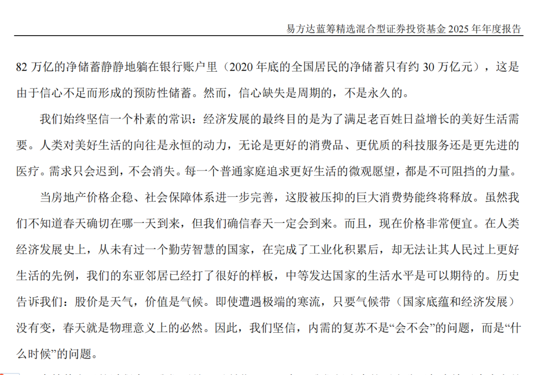在基金2025年年报中,张坤表示,经济发展的最终目的是满足老百姓日益增长的美好生活需要。每一个普通家庭追求更好生活的微观愿望,都是不可阻挡的力量。当房地产价格企稳、社会保障体系进一步完善,这股被压抑的巨大消费势能终将释放。
