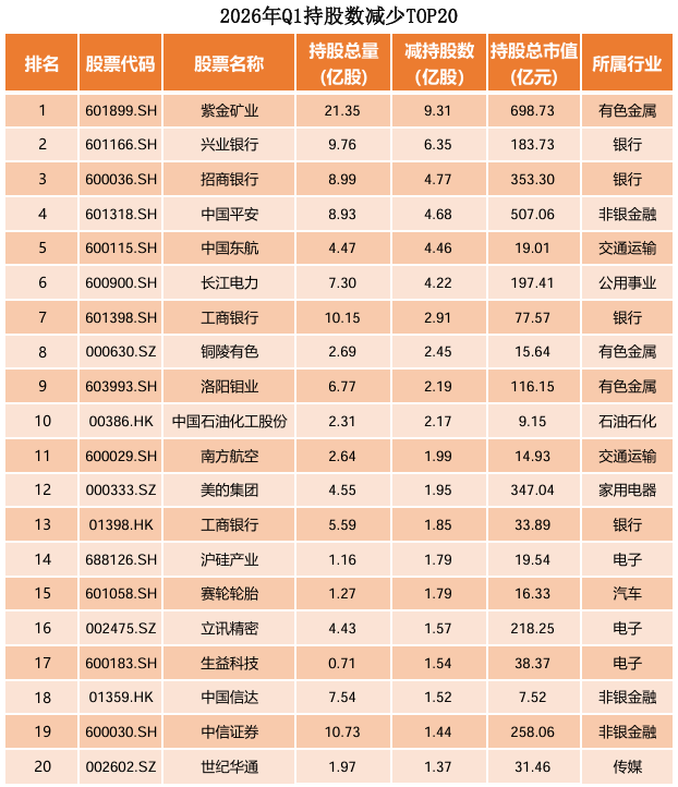 在个股减持TOP20的榜单中,紫金矿业被减持股数最多,2025年年底基金重仓持有该股数量为30.66亿股,2026年一季度降至21.35亿股,减持了9.31亿股;此外,兴业银行、招商银行、中国平安、中国东航、长江电力一季度被减持超4亿股。