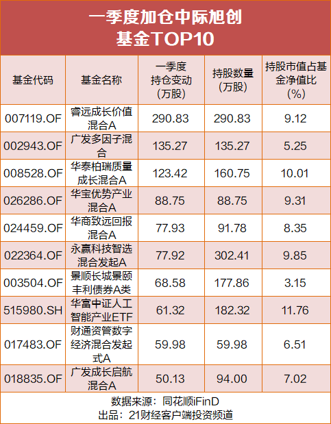 此外,21快讯记者据同花顺iFind数据统计,包括睿远成长价值混合A在内,广发多因子混合、华泰柏瑞质量成长混合A等多只基金今年一季度大举加仓中际旭创。