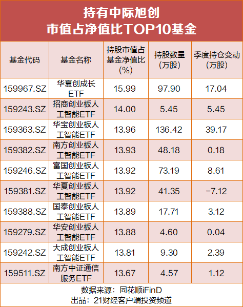 市场上共有83只基金(如华夏创成长ETF、招商创业板人工智能ETF、华宝创业板人工智能ETF等)持有中际旭创的市值占基金净值比例超过10%,其中相当一部分跟踪的是创业板人工智能指数。