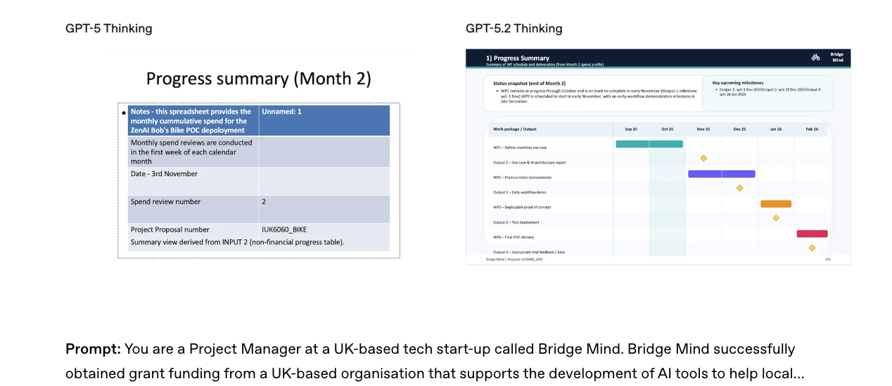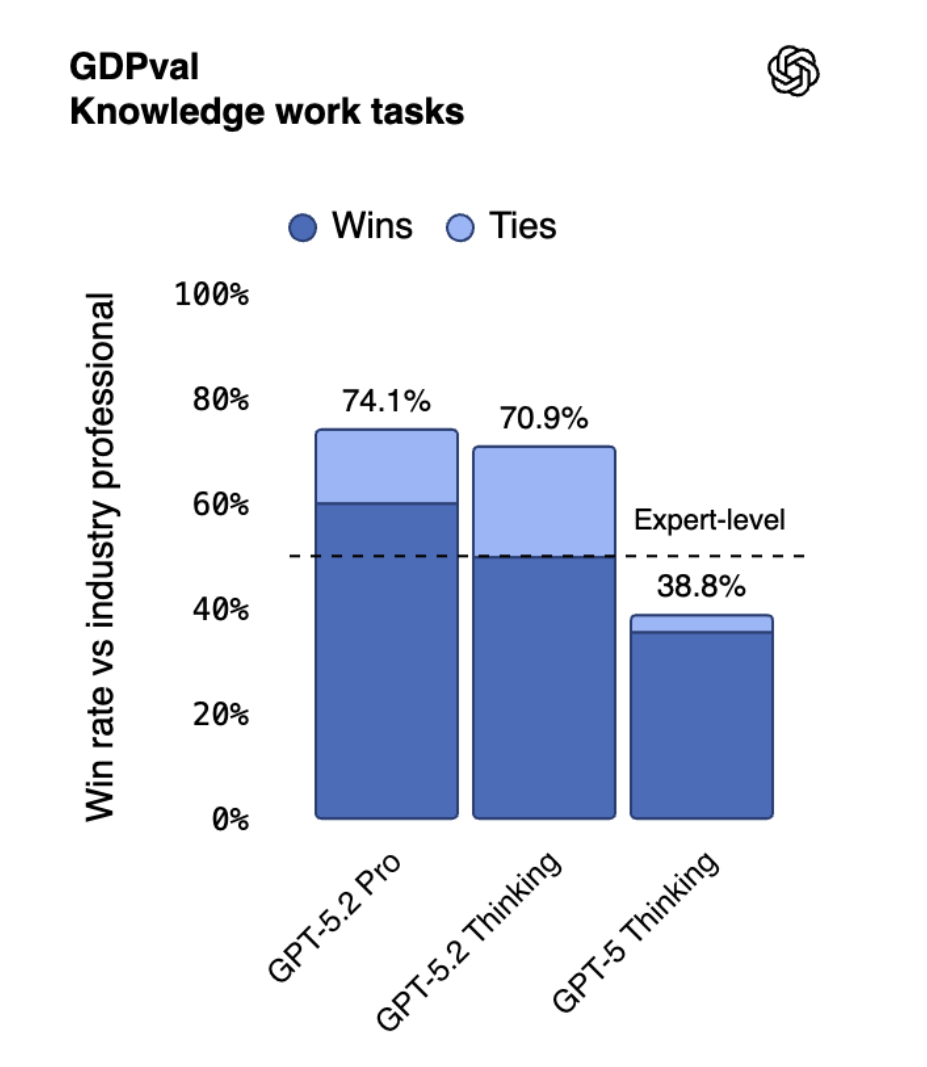 OpenAI特别强调,GPT5.2 Thinking是迄今为止最适合现实世界专业用途的模型。在评估涵盖44个职业的知识型工作任务的GDPval测试中,有70.9%的对比结果优于或持平于顶尖行业专业人士,这些任务包括制作销售演示文稿、会计电子表格、制造流程图或短视频等。