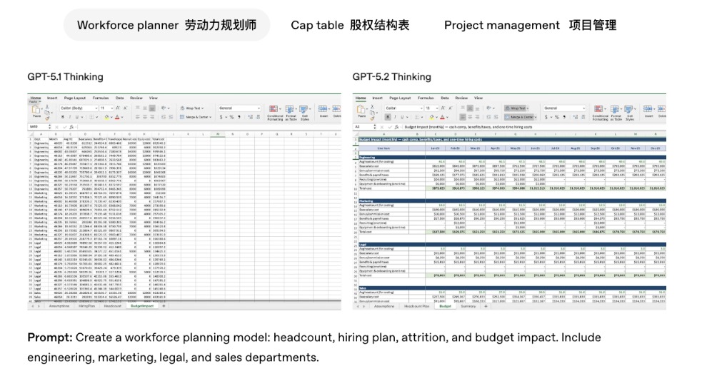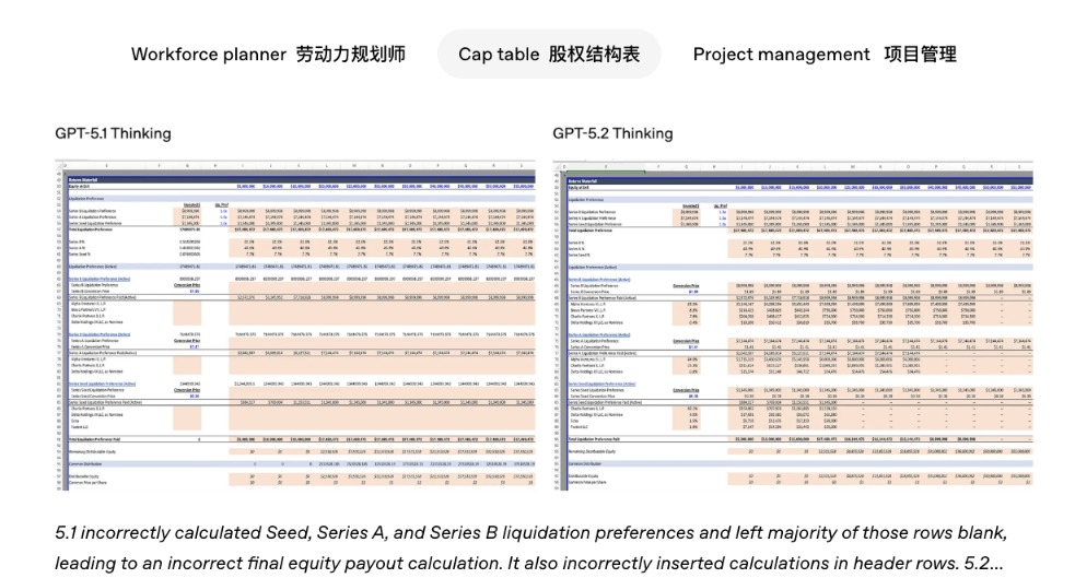 OpenAI介绍称,GPT5.2是迄今为止在“专业知识工作方面”表现最好的模型系列,在制作电子表格、制作演示文稿、图像感知、编写代码以及理解长上下文等方面都优于前代产品。