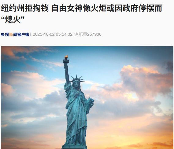 据央视新闻,当地时间10月1日,美国纽约州州长凯西·霍楚尔办公室发言人表示,纽约州不会像此前政府停摆时那样,承担自由女神像的开放运营费用。州长称这次自由女神像火炬可能会“彻底熄灭”。