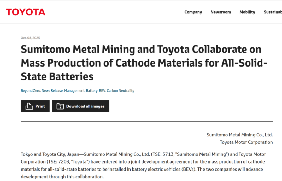 10月8日,丰田汽车全球官网发布消息称,住友金属矿山株式会社(以下简称“住友金属矿山”)与丰田汽车就量产用于纯电动汽车(BEV)的全固态电池正极材料达成合作协议。双方将通过此次合作推进研发进程,固态电池技术有望迎来新突破。丰田汽车还在文内重申,计划于2027年至2028年间推出搭载全固态电池的纯电动汽车。