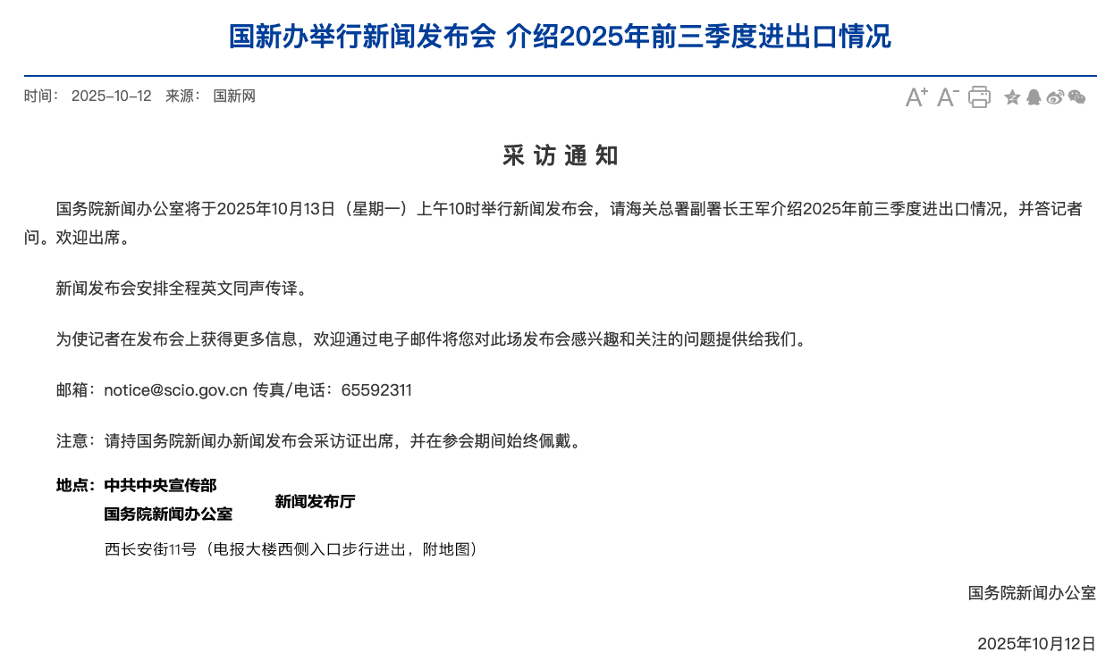 据国新网消息,国务院新闻办公室将于2025年10月13日(星期一)上午10时举行新闻发布会,此次发布会聚焦2025年前三季度进出口情况,届时海关总署副署长王军将亲临现场进行介绍,并答记者问。进出口数据作为经济发展的重要指标,一直备受市场关注,此次发布会预计将为市场提供关键信息。对于进出口企业而言,了解最新进出口动态,有助于制定更合理的经营策略。