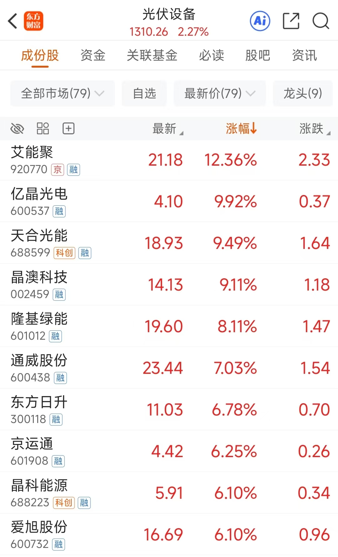 光伏设备板块在10月14日早盘走强,早盘收盘时上涨2.27%,光伏政策与市场反内卷成为主要推动力。板块中亿晶光电涨停,艾能聚大涨超10%,天合光能、晶澳科技、隆基绿能、通威股份等行业龙头也纷纷涨幅靠前。光伏设备板块的走强,很大程度上受行业反内卷将有新进展带动。据证券时报报道,多位行业企业人士向证券时报记者反馈说,预计有重要政策将发布,行业反内卷将有新进展。另据了解,相关主管部门或将发布一份关于加强光伏产能调控的通知文件。