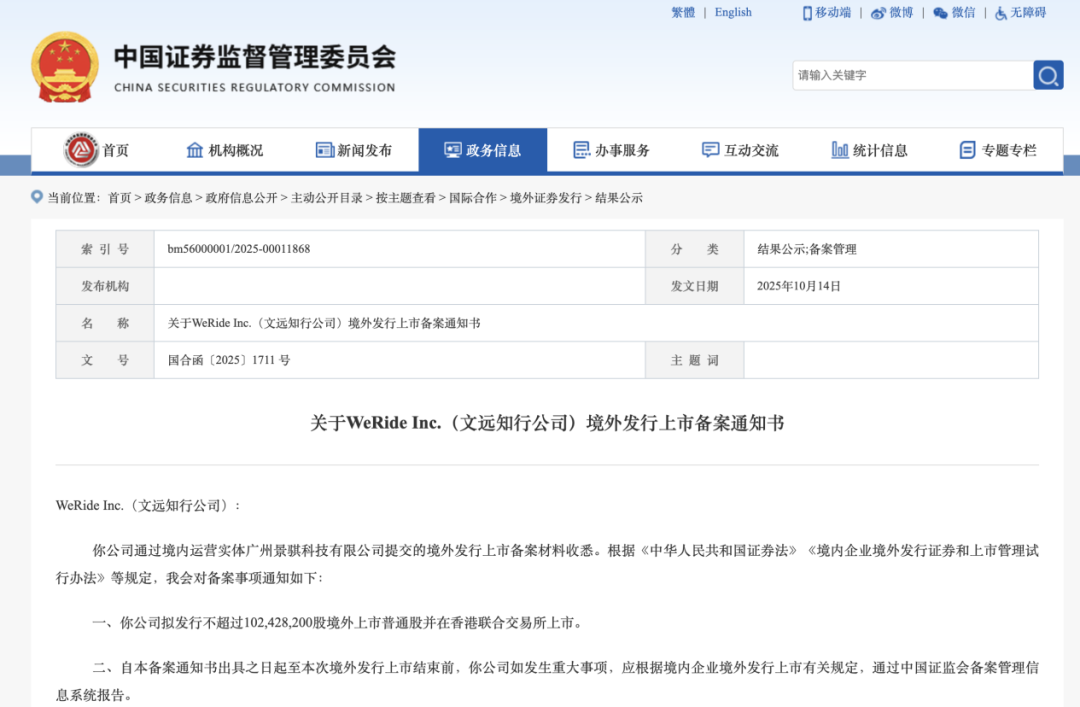 同日,中国证监会发布关于Pony AI Inc.(小马智行股份有限公司,简称“小马智行”)境外发行上市备案通知书,拟发行不超过102146500股普通股并在香港联合交易所上市。